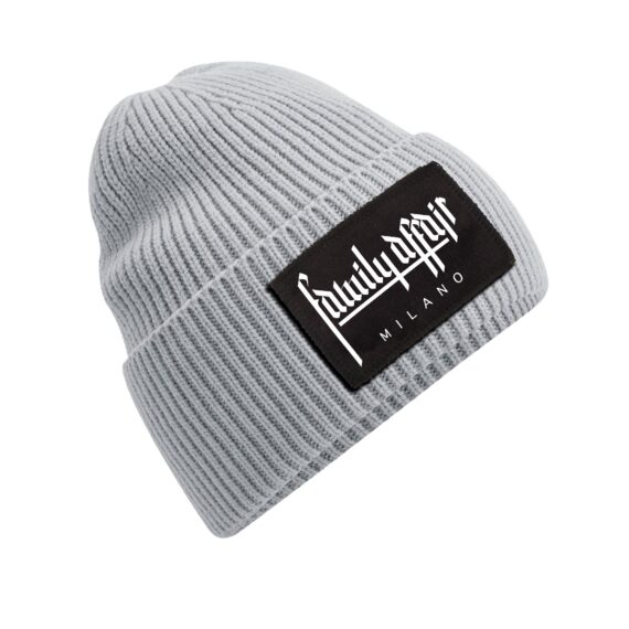 Cuffia con maglia singolo strato in costina. Corona progettata per il massimo comfort. Modello con ampio risvolto. Patch in cotone nero applicata sul risvolto. 52% poliestere riciclato 47% acrilico 1% elastan. Stampa patch: FAMILY AFFAIR