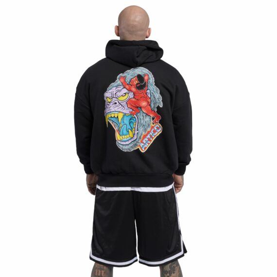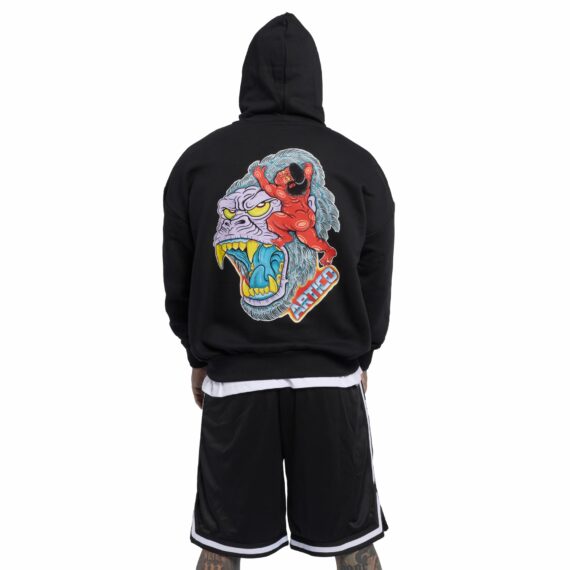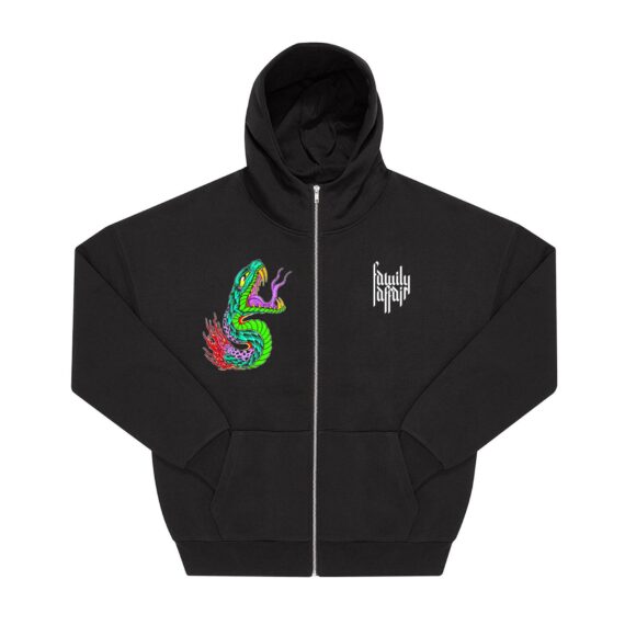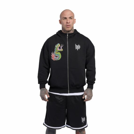 Felpa zip e cappuccio, spalle scese e taglio oversize, gender-neutral, colletto alto, cappuccio foderato in jersey, senza coulisse, cerniera in metallo. 80% cotone 20% poliestere riciclato. Tessuto PST, felpata internamente. Grammatura 350 gr/mq. Stampa fronte destro: Opera COBRA. Stampa fronte sinistro: Logo FAMILY AFFAIR. Stampa retro: Opera KINTARO.