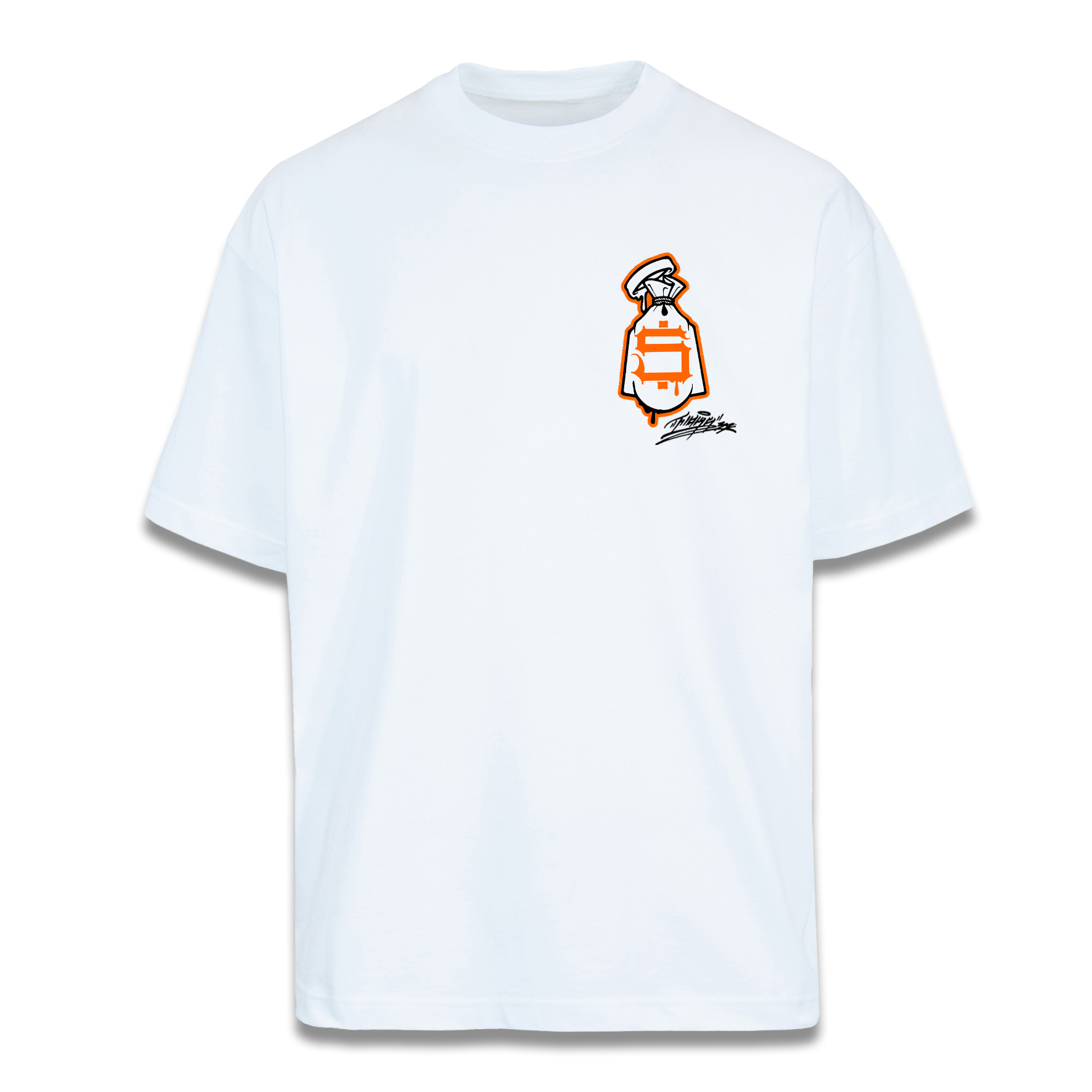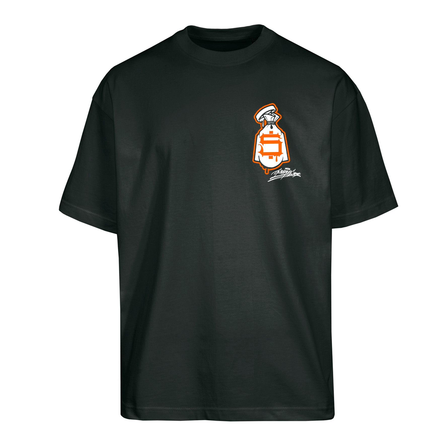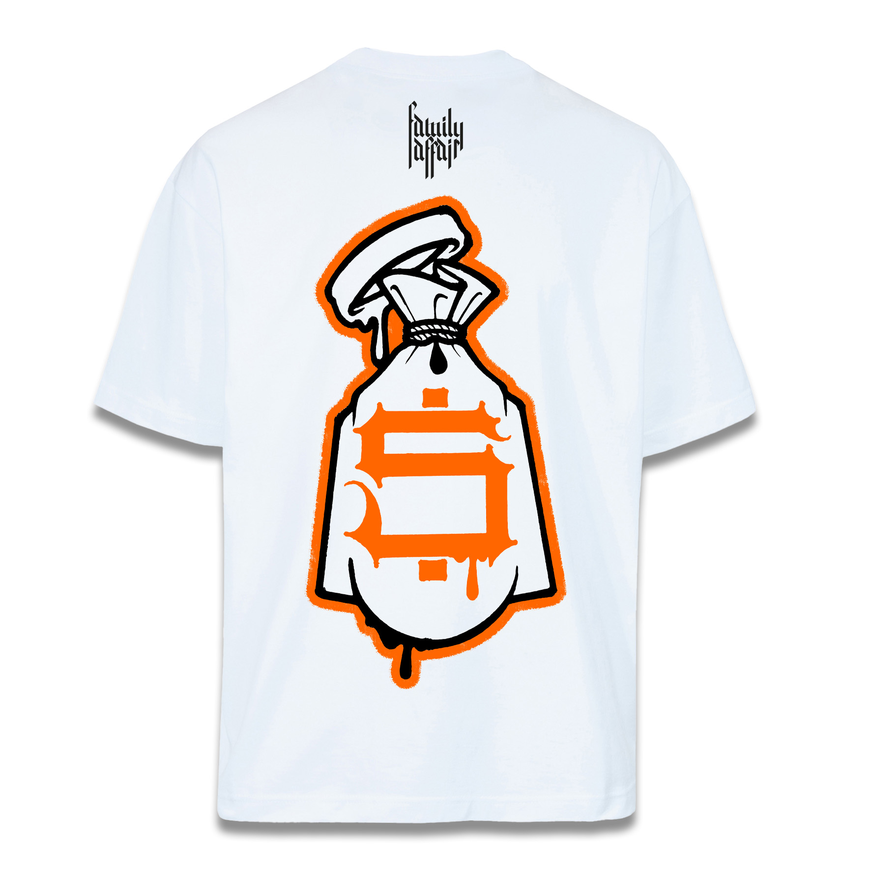 T-Shirt manica corta. Vestibilità Over. Giro manica sceso. 100% cotone ring spun. Grammatura180 gr/mq. Made in Italy. Stampa fronte: opera MONEY BAG e FIRMA FLAKS. Stampa retro: Logo FAMILY AFFAIR + MONEY BAG.